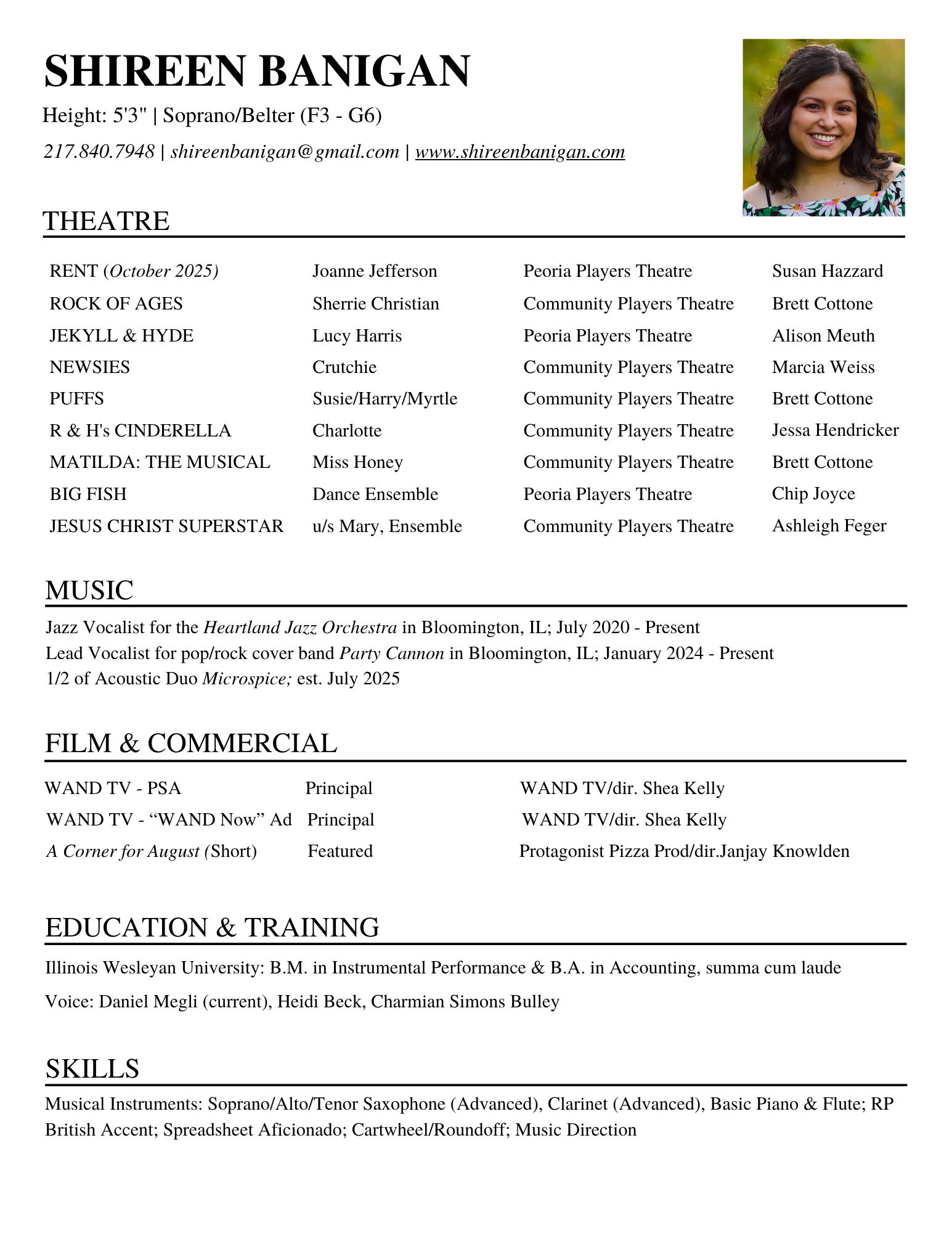 Shireen captivates audiences with vocals for the Heartland Jazz Orchestra, the high-energy pop/rock band Party Cannon, and laid-back acoustic duo Micro Spice. She also brings her talents to the stage, having portrayed Sherrie in Rock of Ages, Lucy Harris in Jekyll & Hyde, Susie Bones in Puffs , Charlotte in Rodgers & Hammerstein’s Cinderella, and Miss Honey in Matilda. Beyond the stage and bandstand, Shireen shares her voice as a cantor at Holy Trinity Catholic Church in Bloomington. Shireen is a summa cum laude graduate of Illinois Wesleyan University, where she earned degrees in Music and Accounting. She currently studies voice with Daniel Megli of Megli Voice Studio. In October, she will take on the role of Joanne in RENT at Peoria Players Theatre.